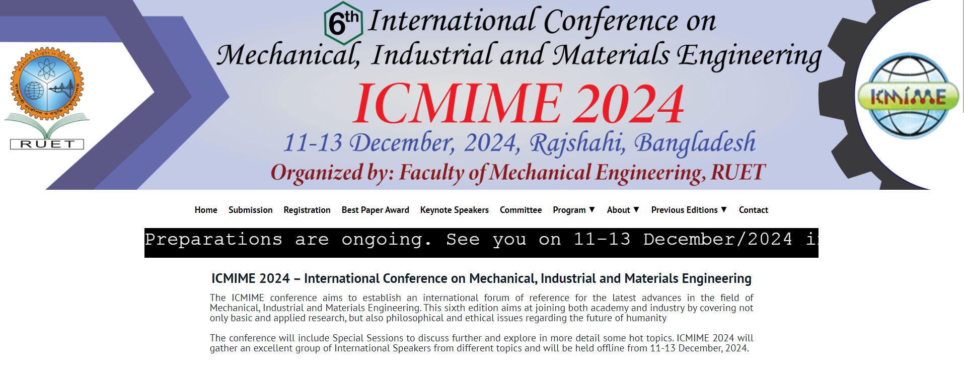 International Conference on Mechanical, Industrial and Materials Engineering (ICMIME 2024) is going to held on 11-13 December, 2024
